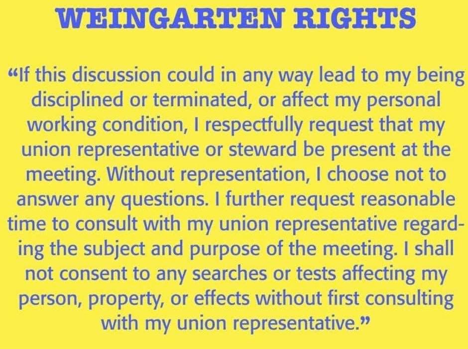 Baton Rouge, LA-Represented employees at all Amalgamated Transit Union Local 1546 properties (CATS, Transdev-LSU, and First Student) are formally reminded that under federal law—specifically the National Labor Relations Act (29 U.S.C. § 157) and the U.S. Supreme Court’s NLRB v. J. Weingarten, Inc. decision—as well as applicable Louisiana labor protections, you have the absolute right to union representation during any investigatory meeting that could lead to discipline; these rights are not automatic and must be clearly invoked by the employee, as employers will not exercise them for you and may attempt to discourage or suppress their use—failure to assert Weingarten Rights can result in waived protections, increased vulnerability, and unilateral employer action.